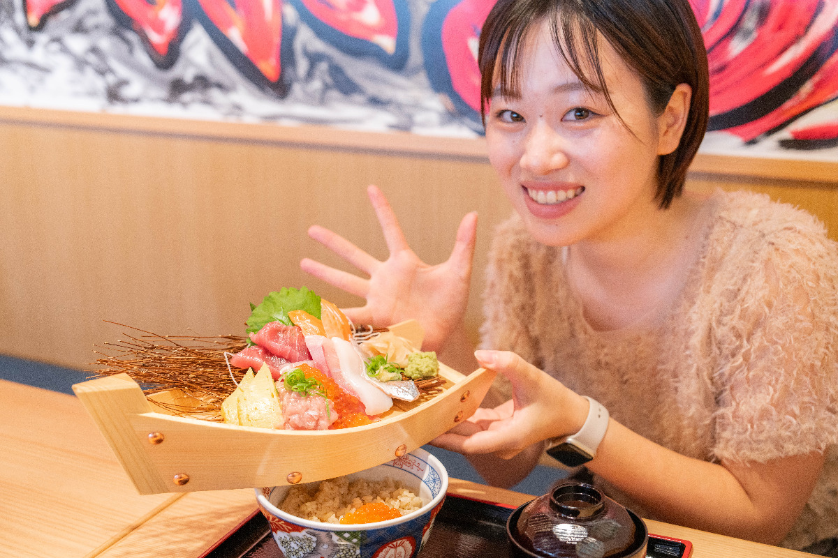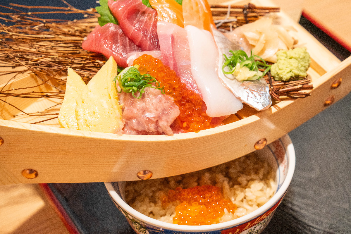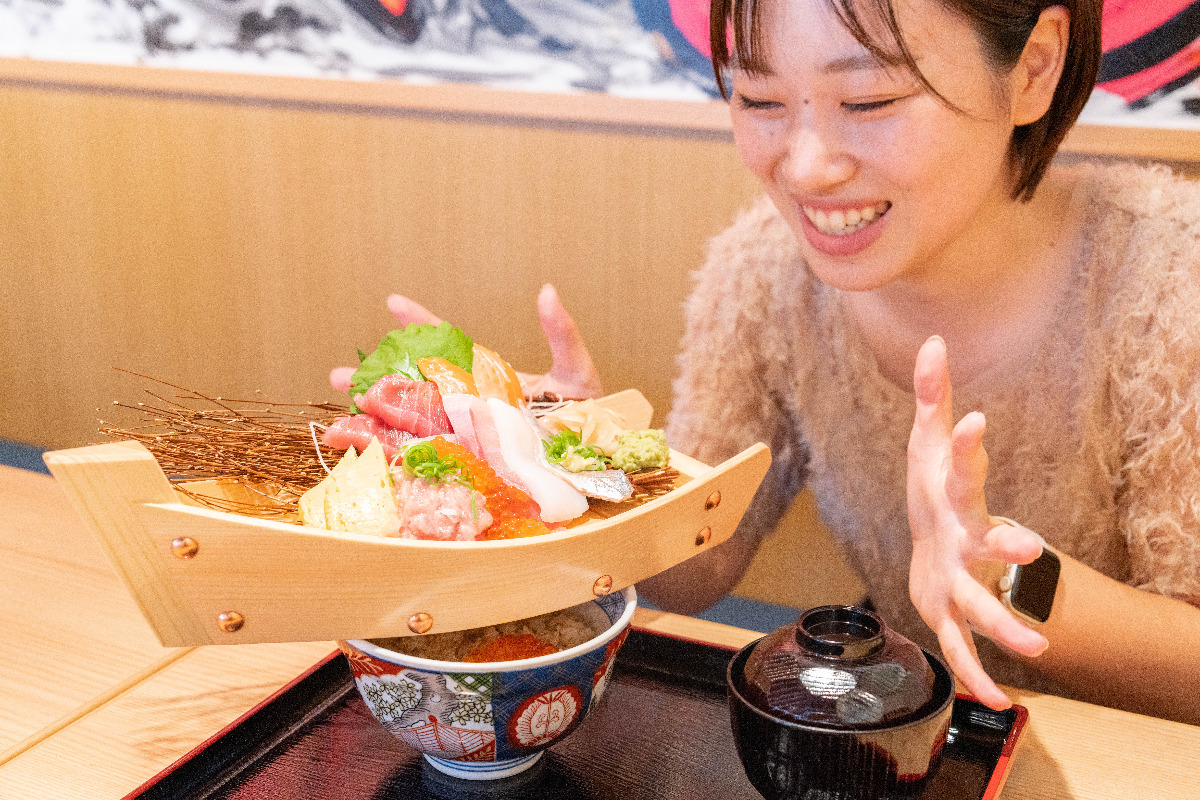 インパクト抜群の「舟盛り丼」は人気のネタ8種類を豪快に盛り付けたランチ限定メニューです。