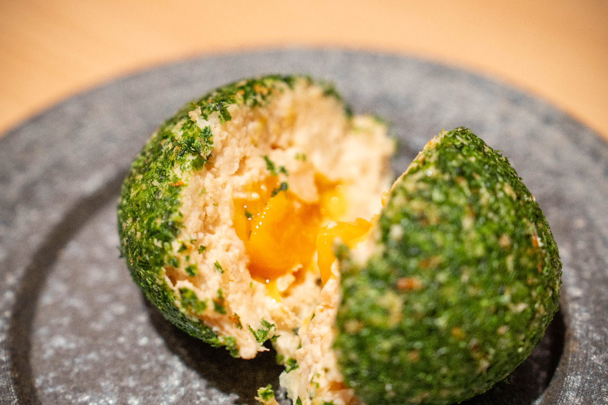 じゃがいもと寿司屋ならではのガリを混ぜ合わせたもので卵黄を包んだ新感覚のポテトサラダです。割ると中から卵黄が出現します!