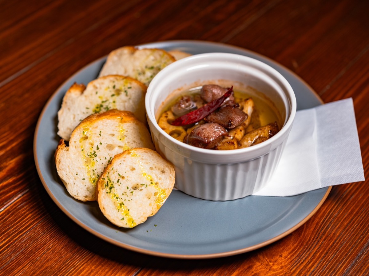 夜メニューでぜひ味わってほしいのが、「レンコンとズリのアヒージョ」(税込780円)。ぷりぷり食感のズリとシャキシャキのレンコンが、香り豊かなオイルでじっくり煮込まれた一皿です。