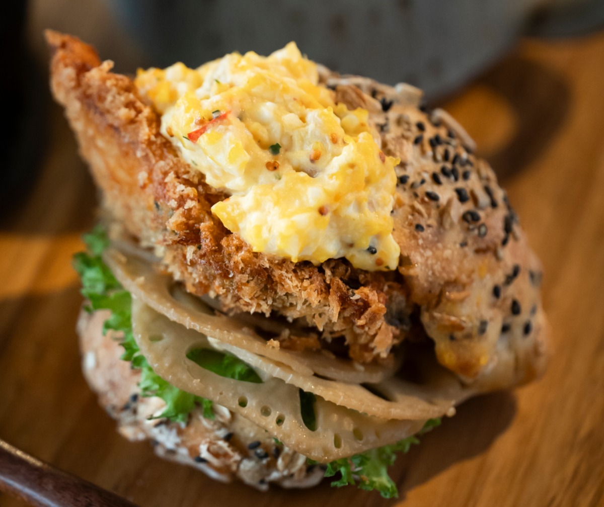 大葉を巻いて揚げたアジフラ イときんぴら蓮根をサンド。自家製タルタルソースが合う!