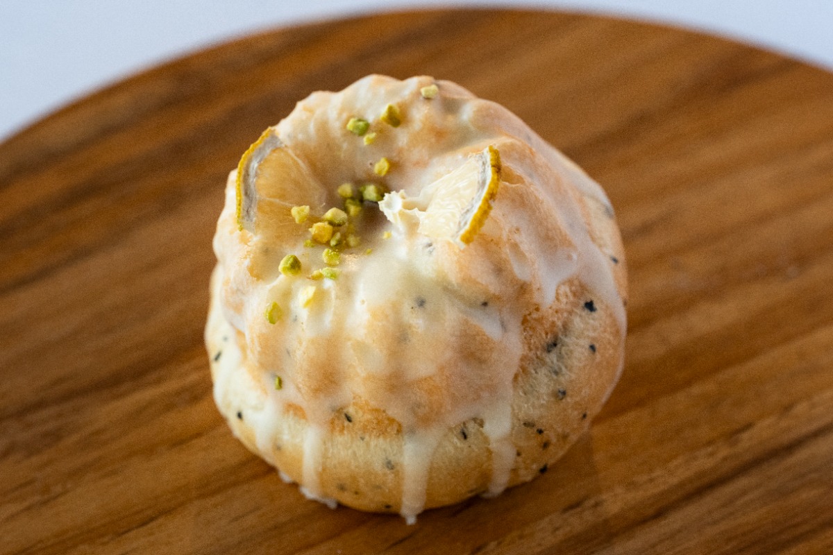 アールグレイ生地にレ モングレーズをかけた パン。中にはホワイト チョコ、オレンジピール、 マカダミアンナッツが入っています。