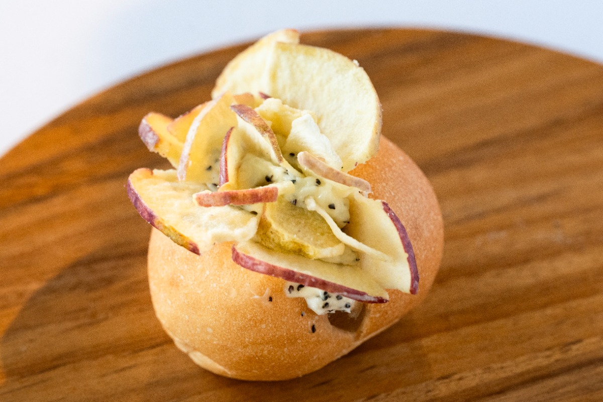 ふんわりパンにリンゴの コンポートとアールグレ イのマスカルポーネク リームを合わせ、リンゴ チップでおめかし。
