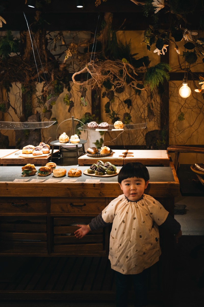 奥に広がる岩苔庭のテイストに合わせ、店内には苔玉や根っこなどを装飾。灯りもあえて控えめにし、まるで土の中でパンを選んでいるような不思議な感覚を楽しめます。