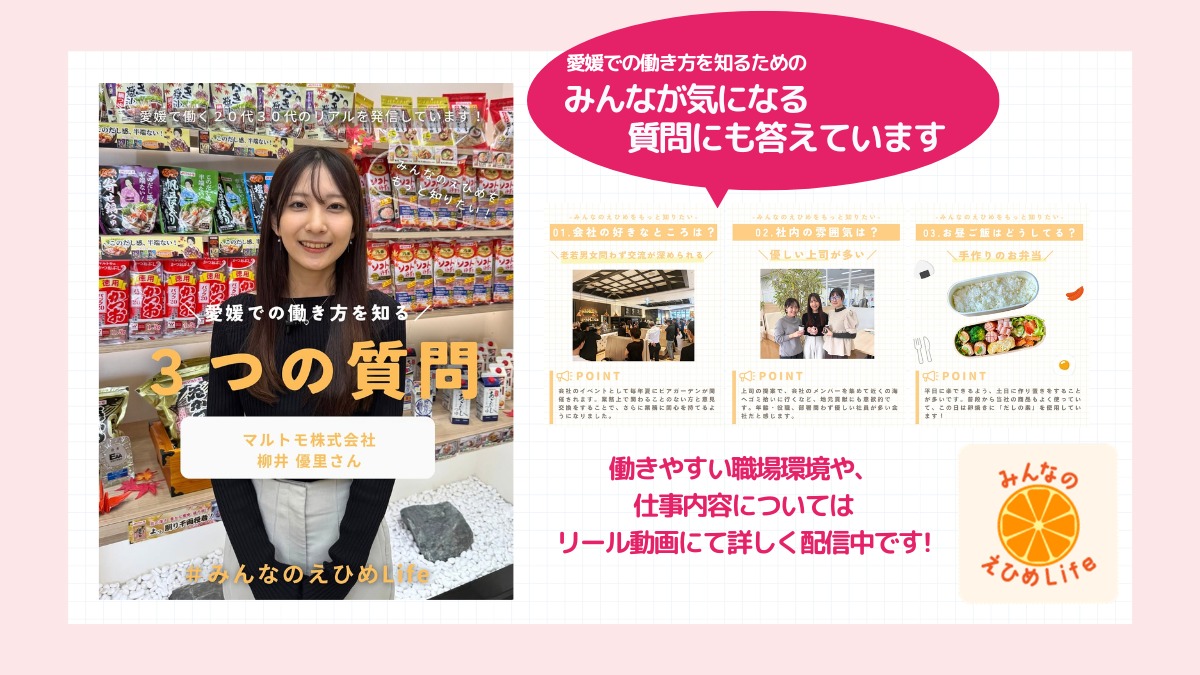 インタビューに答えてくれた20~30代のみなさんの目線で、愛媛での働きやすさをリール動画&質問形式で配信中です。