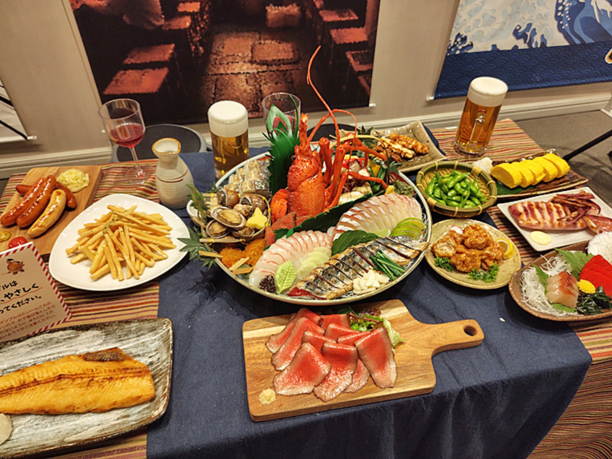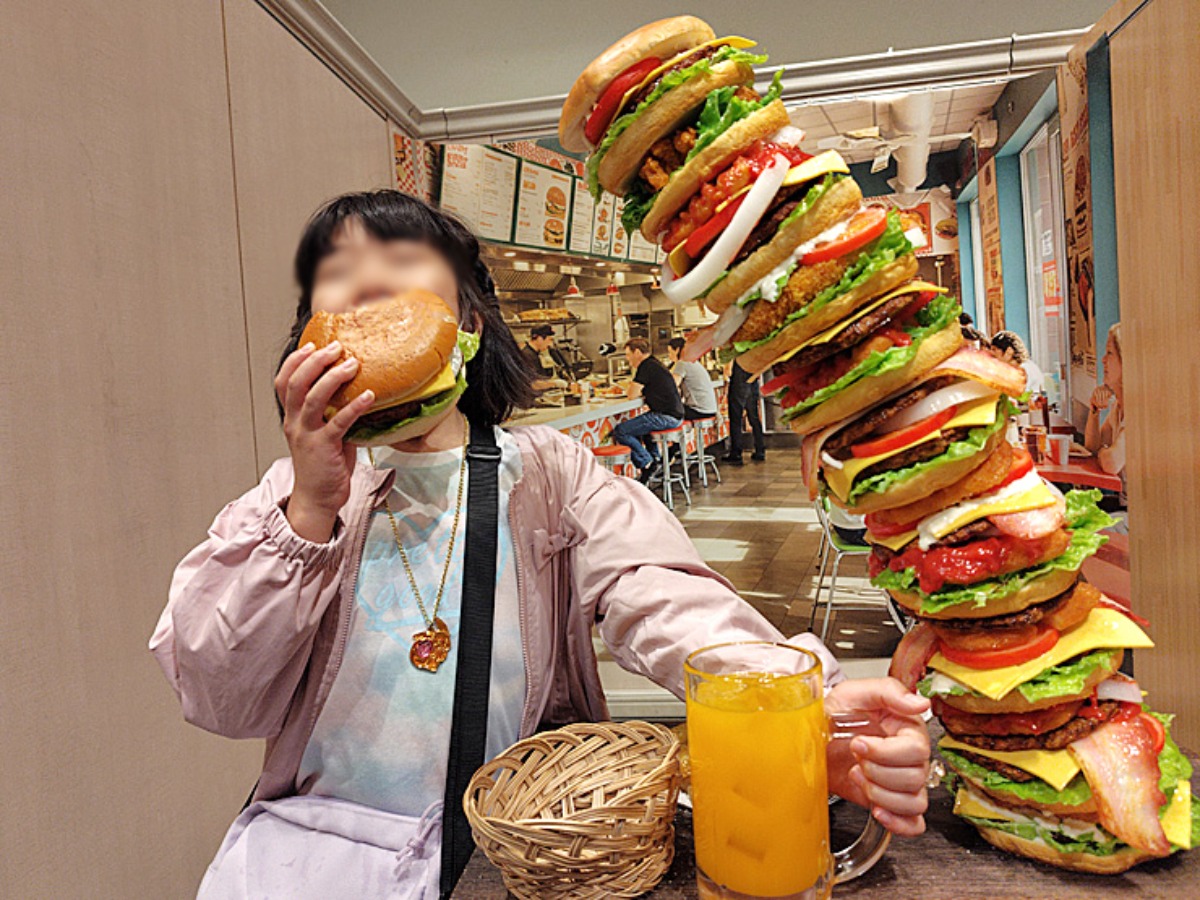 大盛サンプルを使って面白写真が撮れるコーナーでは、山盛りの唐揚げや、タワーのように積み上げられたハンバーガーを持ち撮影!