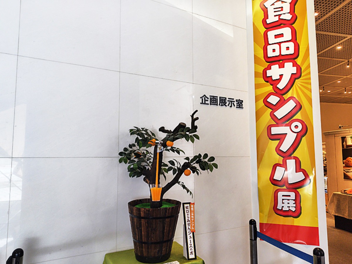 特別展の会場入り口前には、愛媛ご当地サンプルの「蛇口からみかんジュースの木」がドーンと展示されていました。