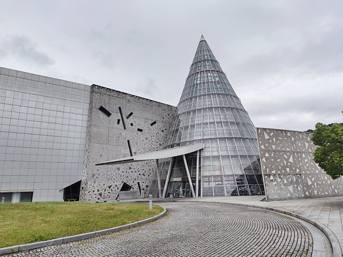 この日は梅雨入り前の薄曇り。特徴的な外観の愛媛県総合科学博物館