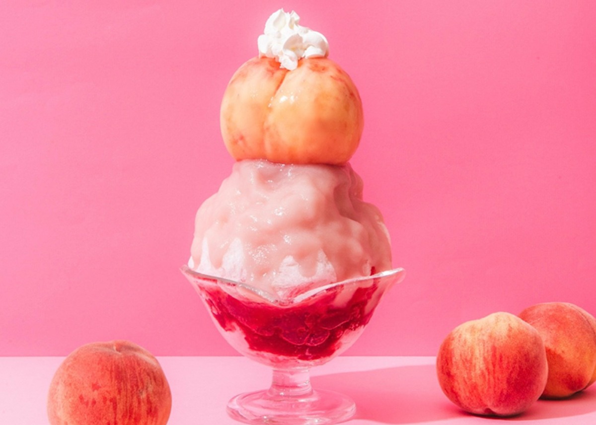 こちらは、桃を丸ごと1個使用した「桃のかき氷」。大きな桃がどんとのせられた姿は、まるでパフェのような華やかさ!油断すると大きな桃が転げ落ちてしまいそう!