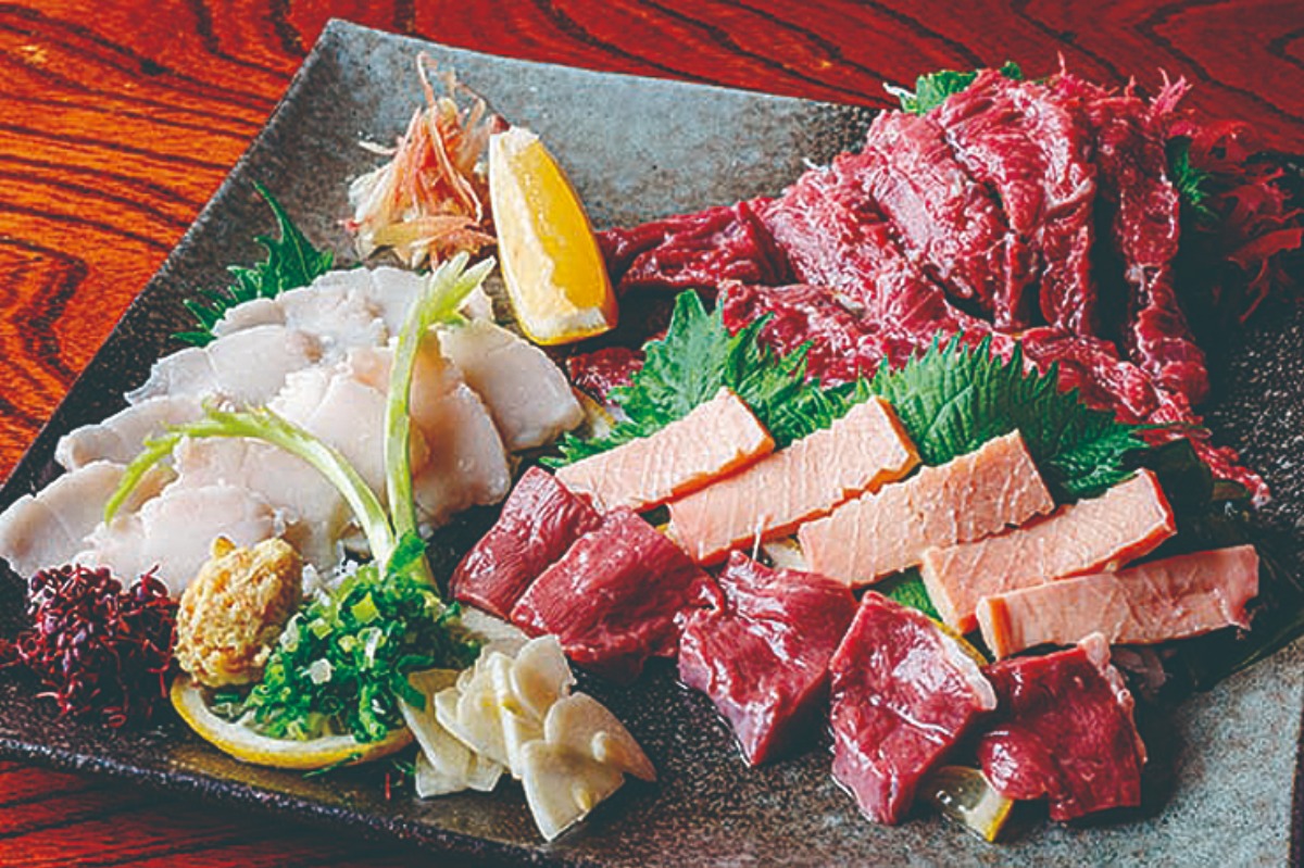 本場熊本から直送される鮮度抜群の馬肉を使った馬刺しは、部位ごとに異なる食感が楽しめる