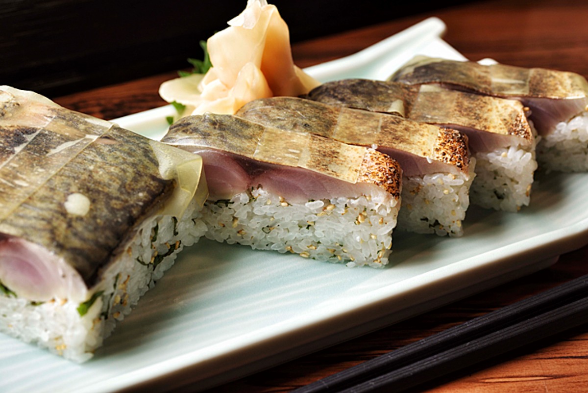 炒りゴマと大葉入りのシャリに、脂がのったサバを炙ってのせた人気メニュー