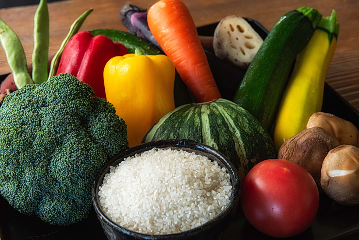 米は代々米農家の店主自ら栽培するヒノヒカリ。彩り豊かで新鮮な野菜や果物は、地元西条の農家や「周ちゃん広場」で買い付けている