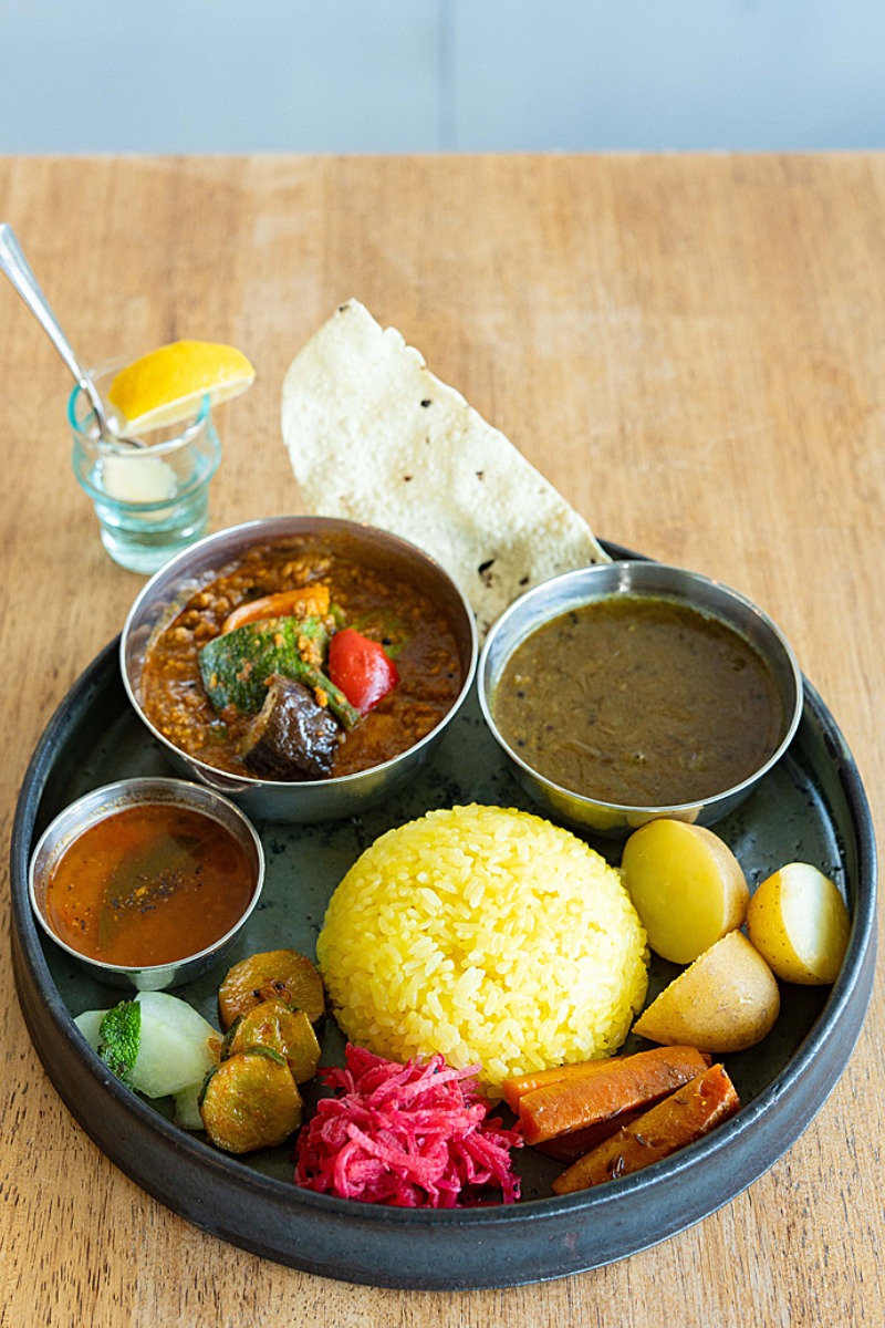 地元産米のターメリックライスは、プラス110円でインド産バスマティライスに変更可。スパイスおかず、スープなどと一緒に自由な食べ方で楽しめる。ベジタリアン対応もOK(予約推奨)。心身を整える食体験をぜひ。