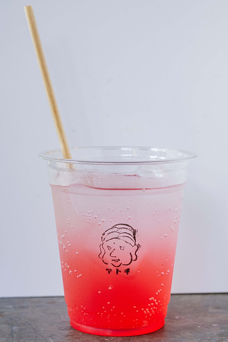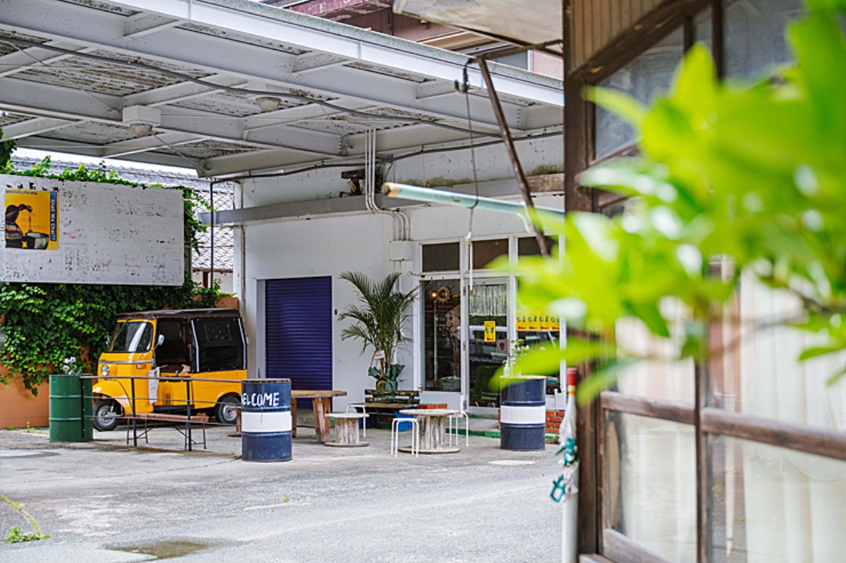 ガソリンスタンドの「跡地」に店を構えている。購入したドリンクを片手にベンチで休憩