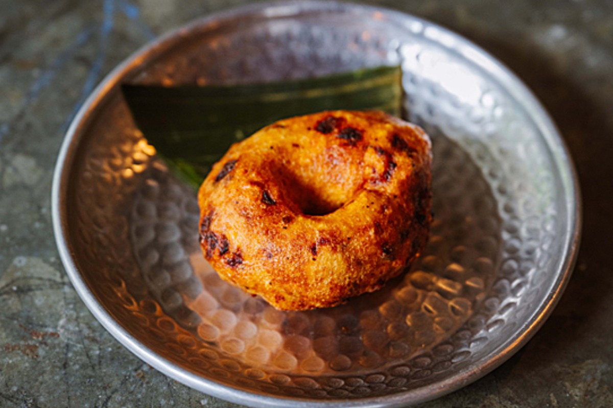 \豆と野菜、スパイスで作るインドの軽食「ワダ」(200円)。/