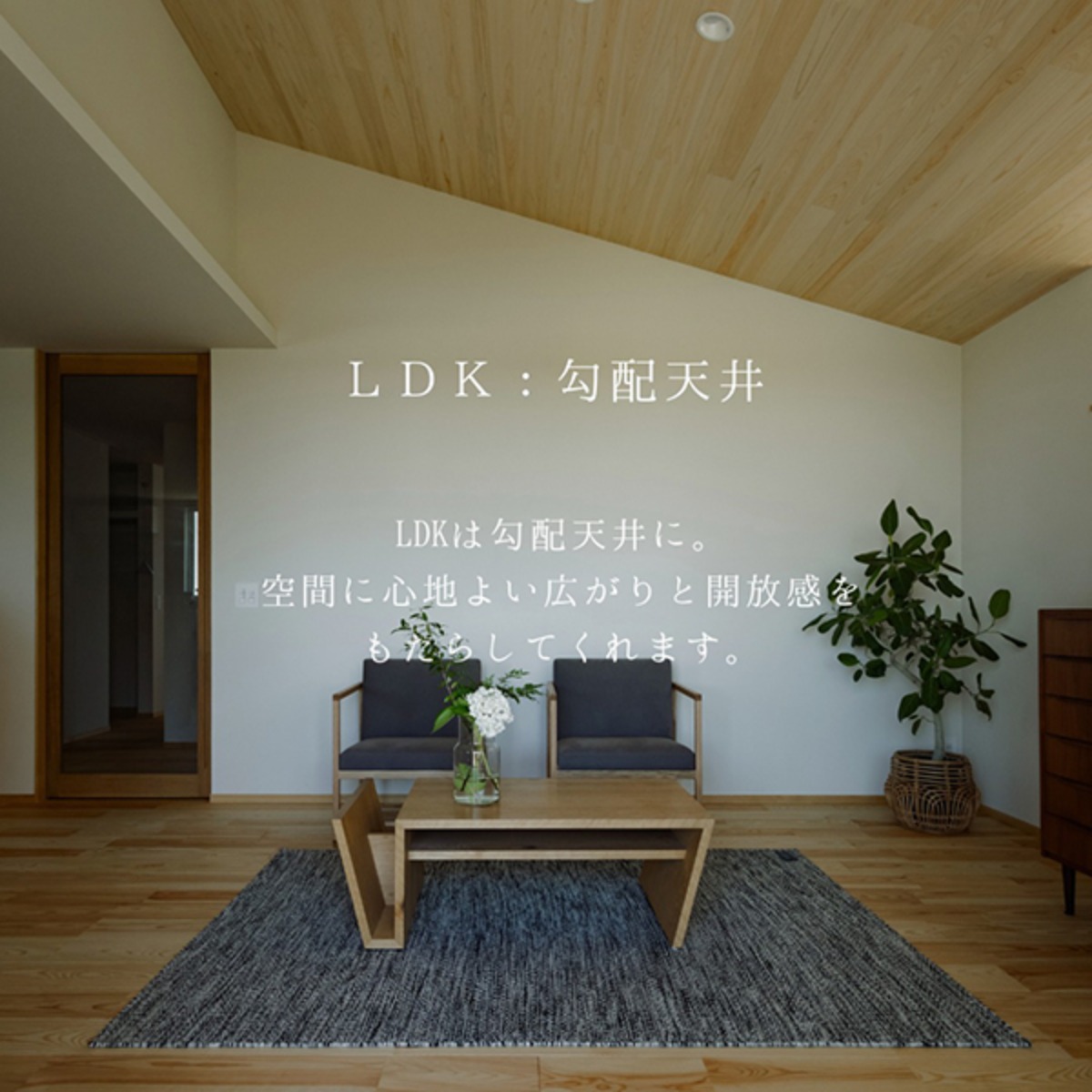 KURASUこだわりの勾配天井を施工しているリビングで、開放的な空間をお楽しみください。