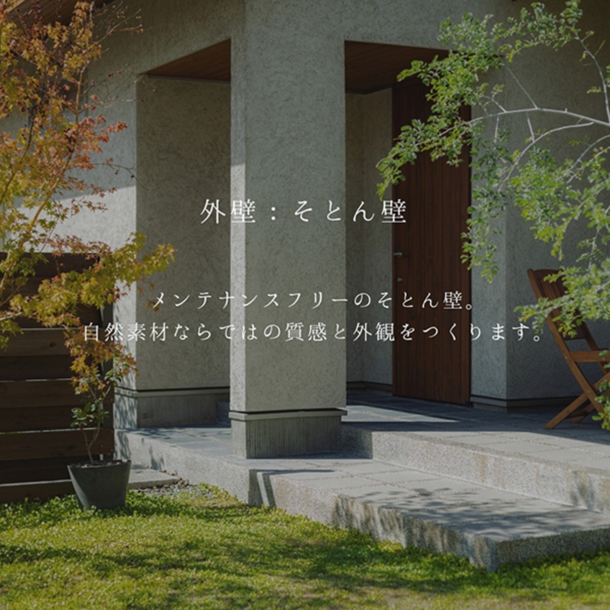 落ち着いた雰囲気の住宅街にたたずむ平屋のモデルハウスは、深い軒と塗り壁の外観が辺りの風景に溶け込む自然と調和した家です。