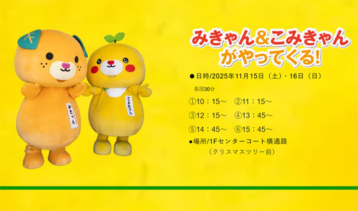11月15日(土)・16日(日)には愛媛県の人気キャラクター「みきゃん」と「こみきゃん」が登場し、親子での記念撮影や交流も楽しめます。