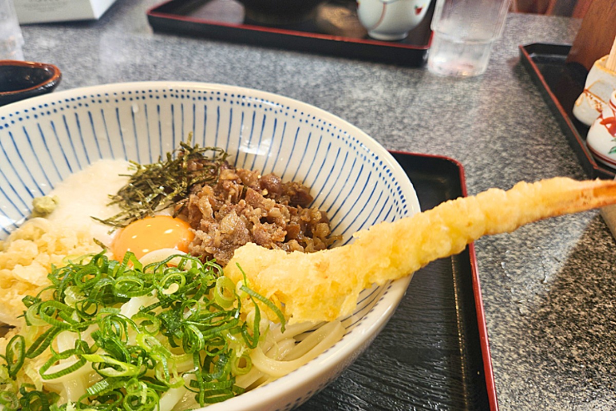 見た目は少し濃いめですが、山芋・温玉・甘辛く味付けされたお肉・エビ天までのった豪華な一杯。