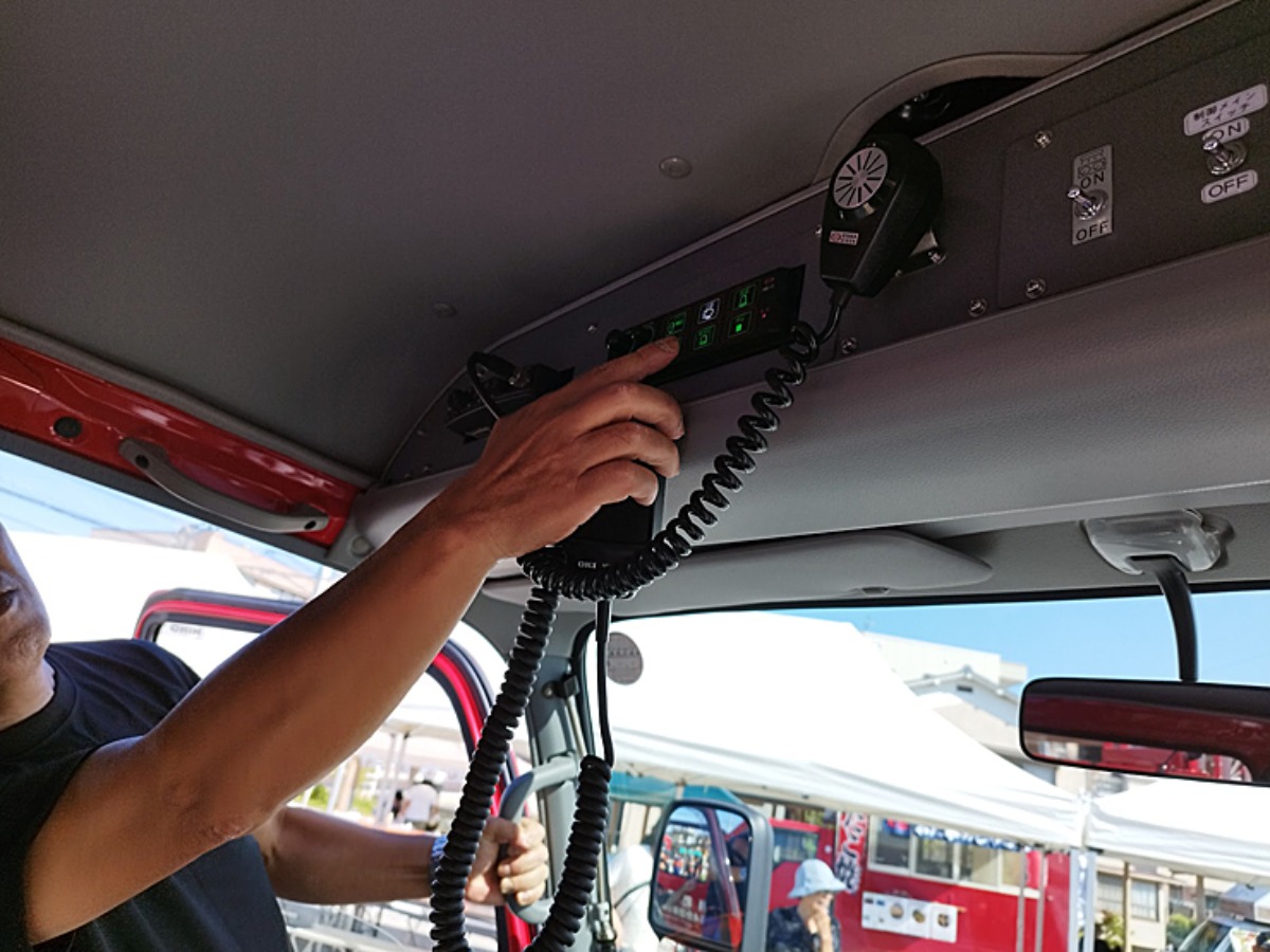 息子が運転席に座って消防団員気分を噛み締めていると、消防団のお兄さんの粋な計らいで消防車のサイレンを鳴らしてくれました!