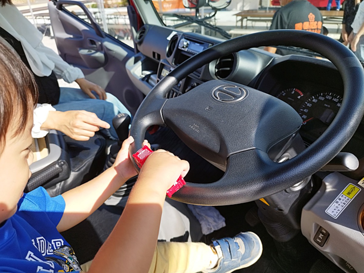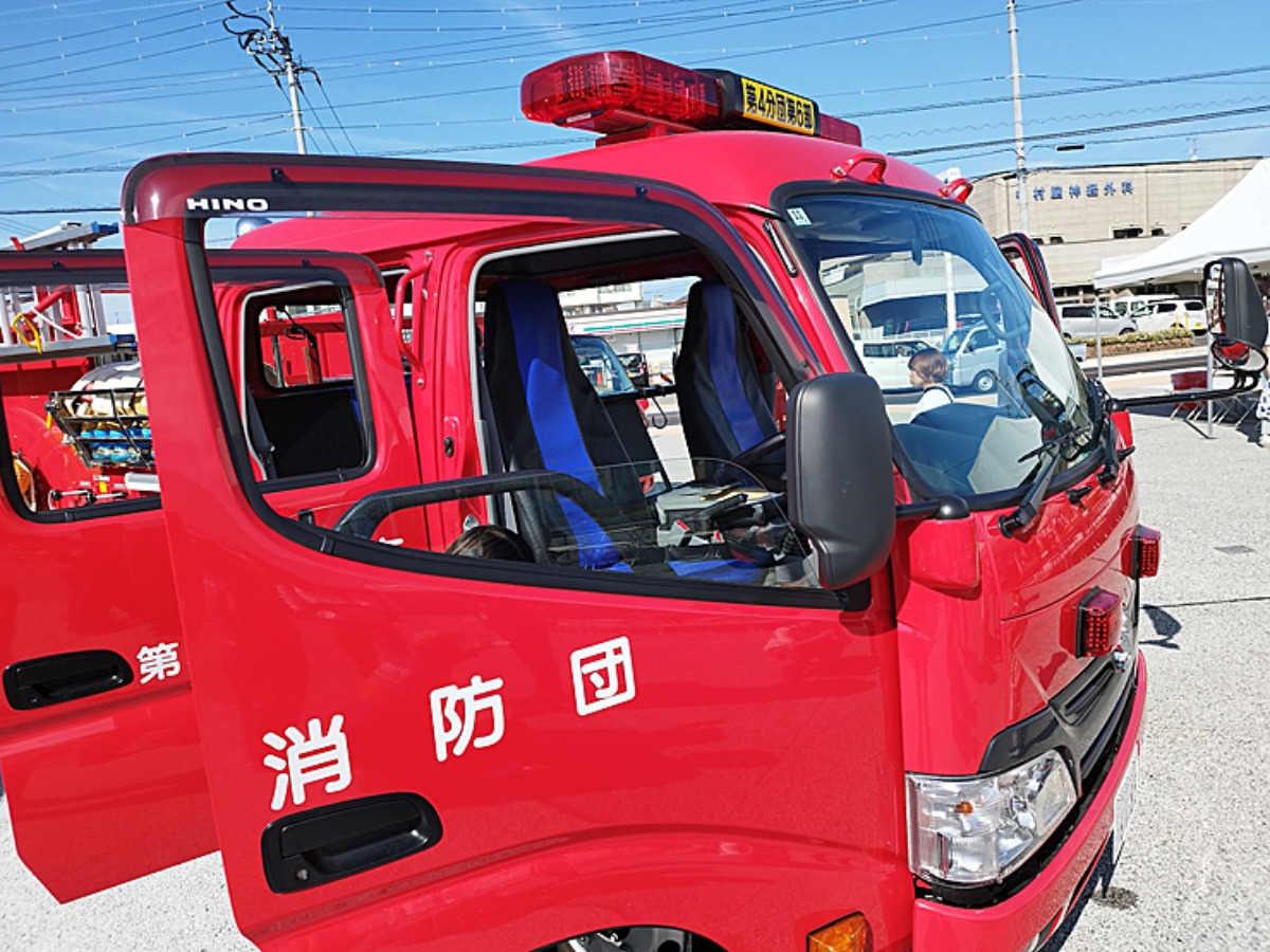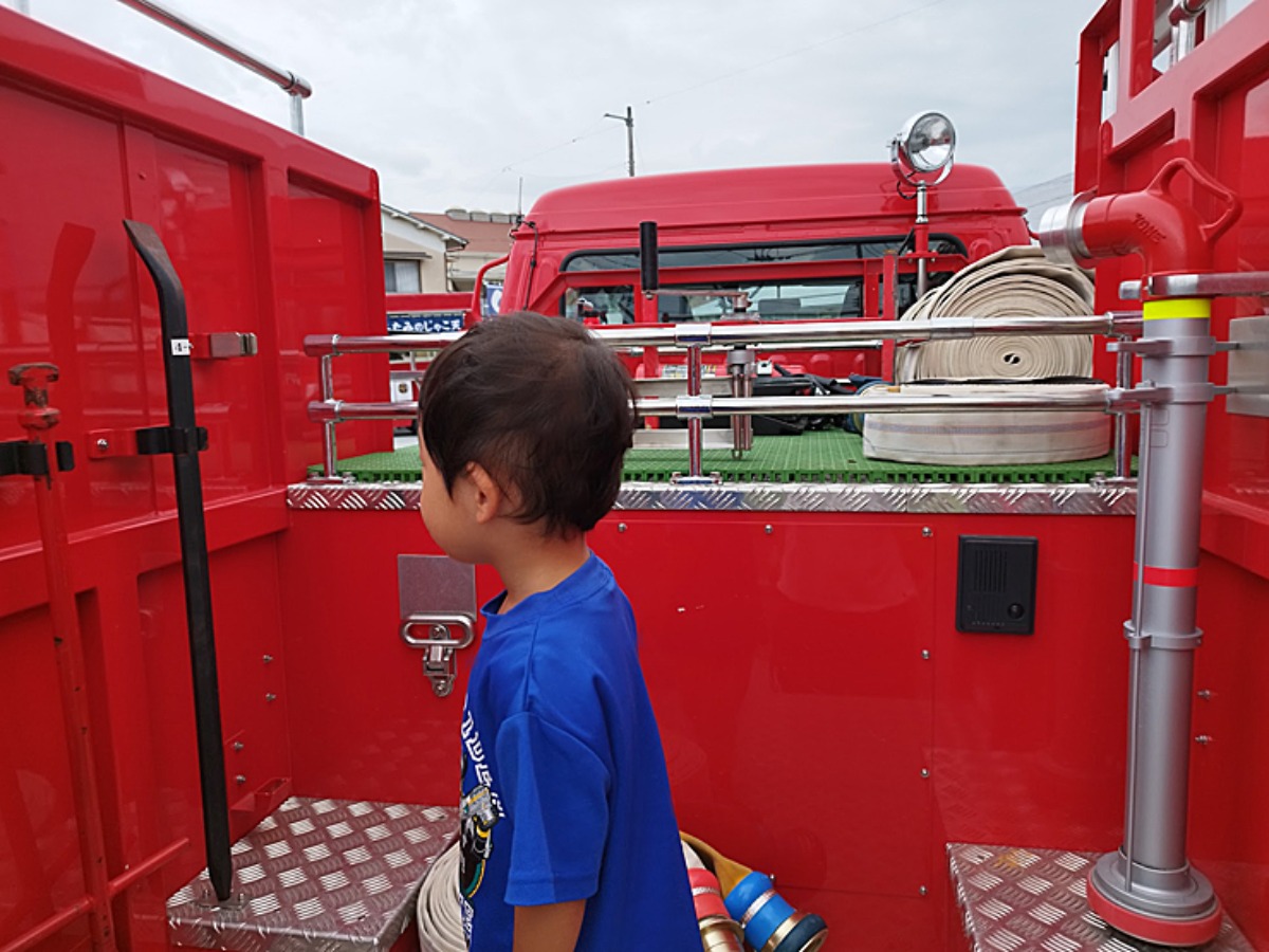間近で見られるのは勿論、消防団の方々がアシストしてくれて消防車の乗車体験をさせてもらえました。