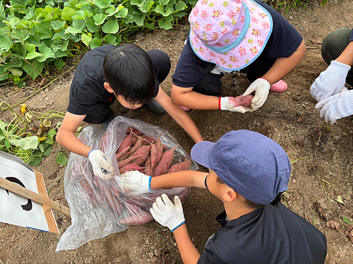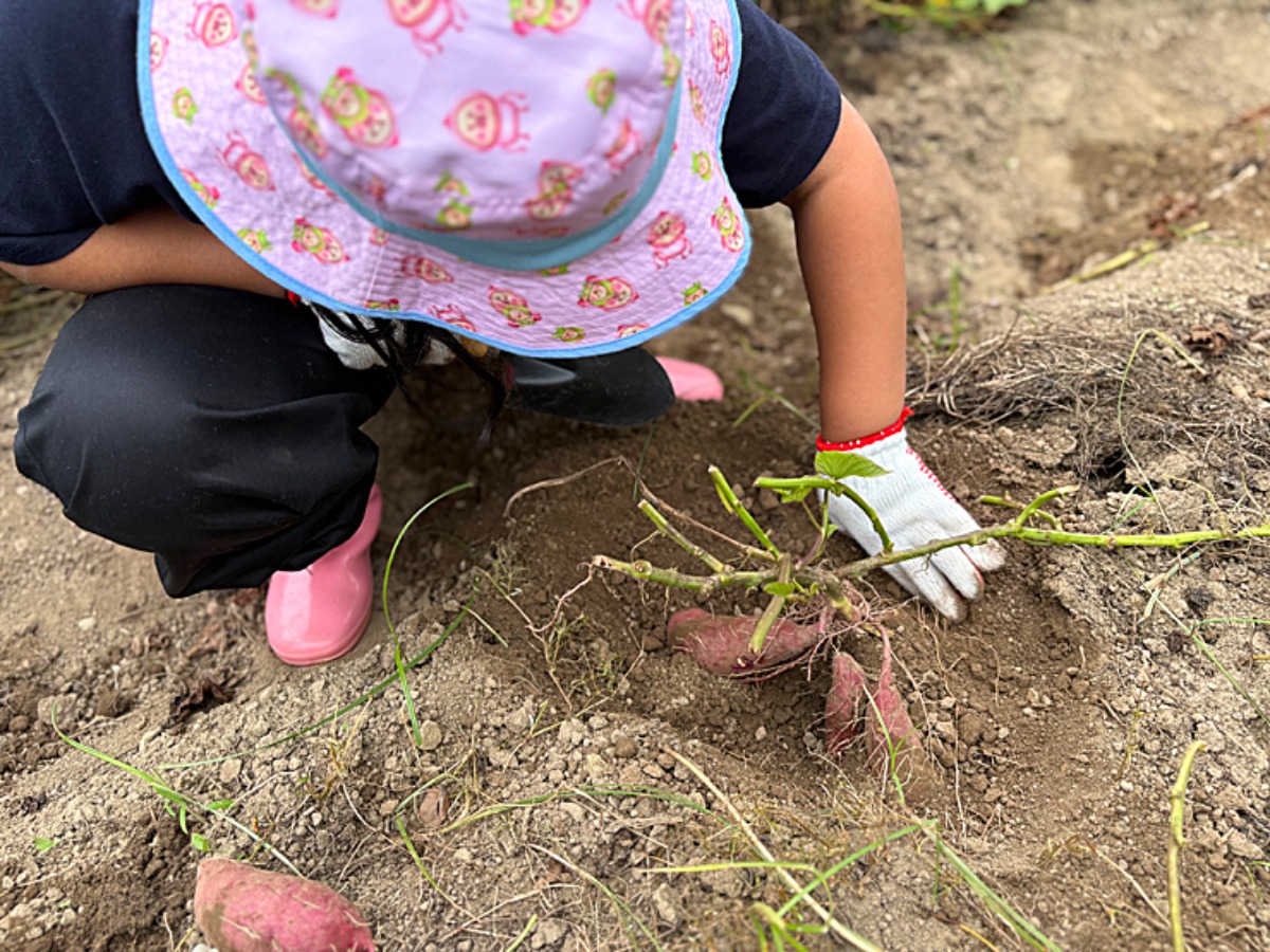最初は上手く掘れなかった子どもたちですが、掘り進めているうちに、さつまいもの赤紫の皮ががチラッと見えてテンションアップ!!
