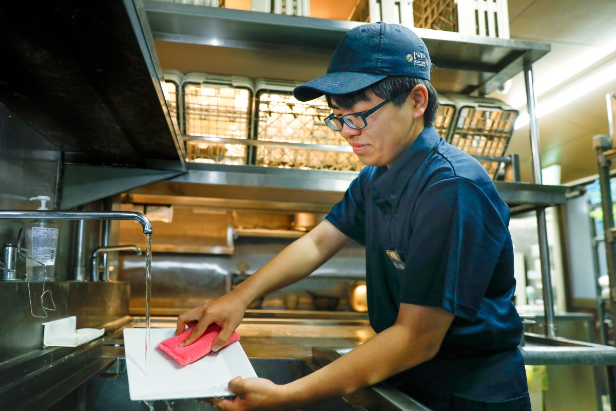 高校生のころから自宅でもやっている皿洗い。綺麗になっていくのが好きで厨房の掃除も率先してやっています。