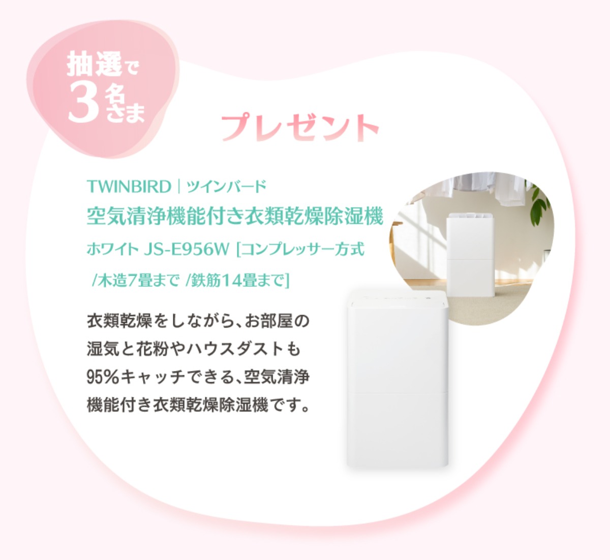 今回は、『【TWINBIRD|ツインバード】空気清浄機能付き衣類乾燥除湿機 ホワイト JS-E956W [コンプレッサー方式 /木造7畳まで /鉄筋14畳まで]』を抽選で3名さまにプレゼントいたします!