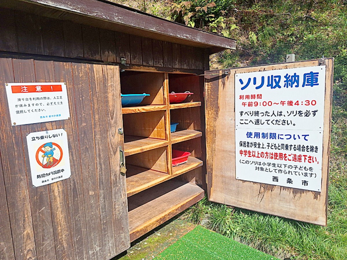 ソリは収納庫に入っています。滑る前に、注意事項をチェックしておくと安心ですよ。