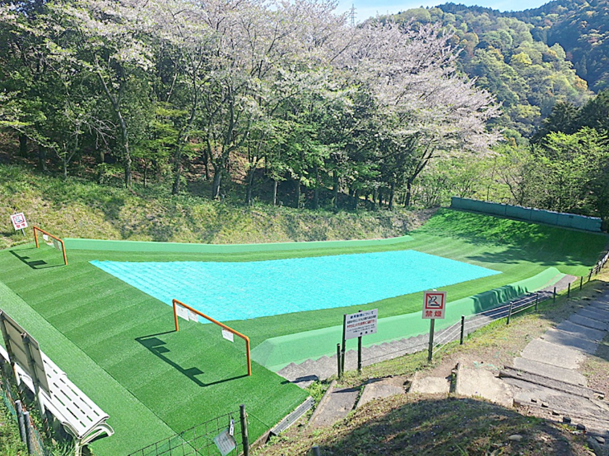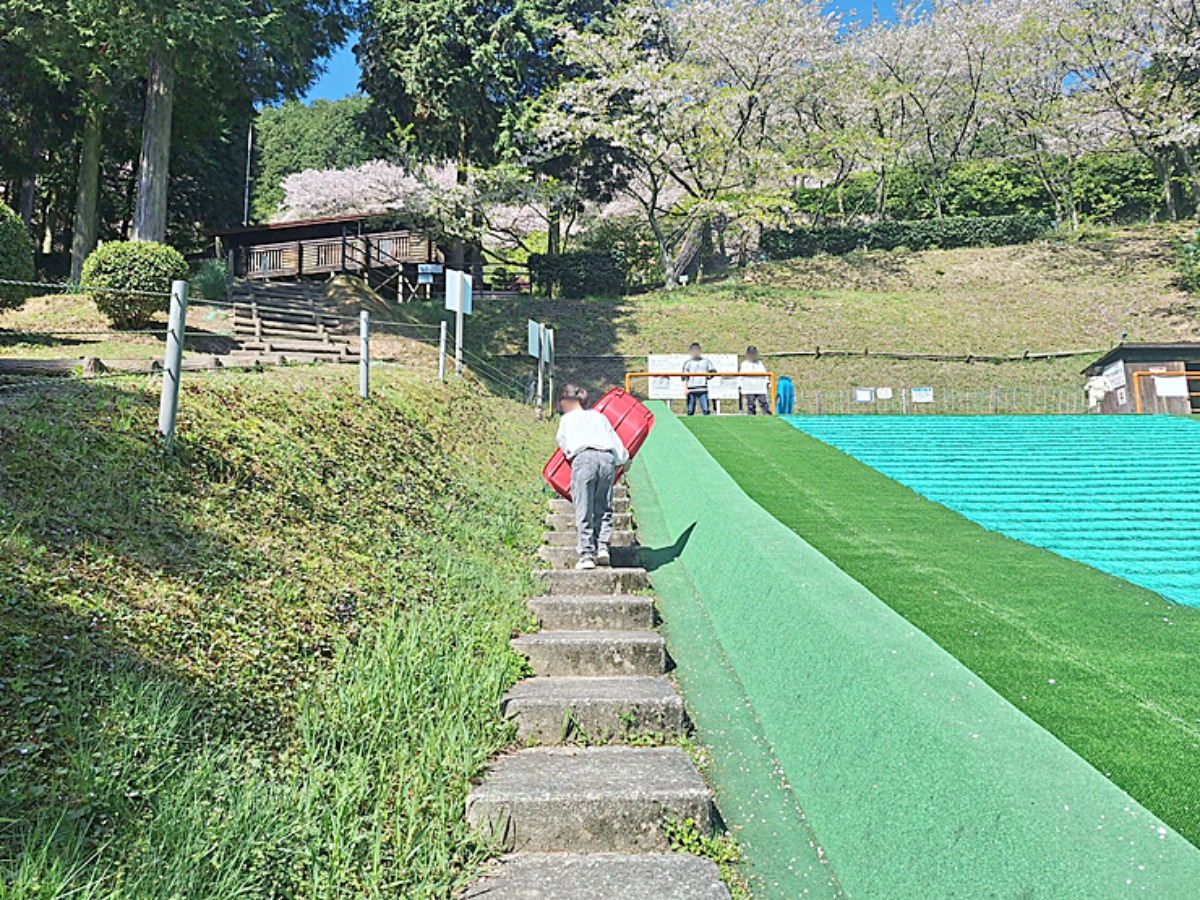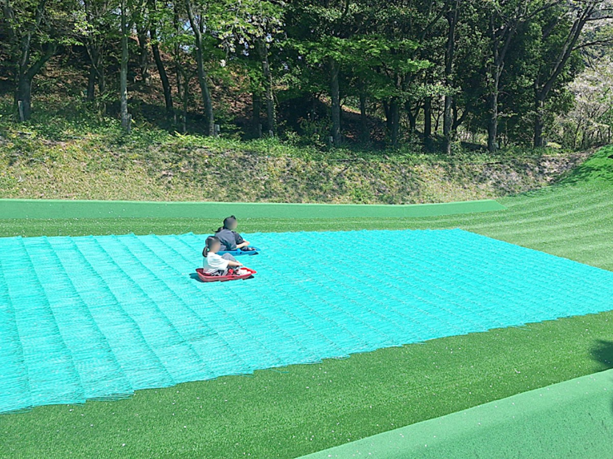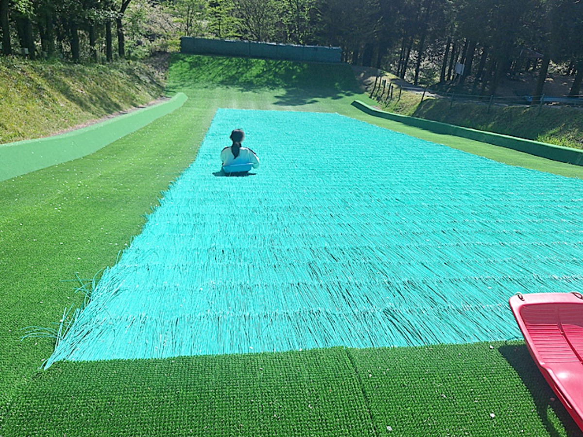 管理事務所からすぐのところに、鮮やかなグリーンが目を引く「人工芝すべり台」があります。専用のソリを使って滑るこのすべり台は、子どもたちもとても楽しみにしていたスポットです。
