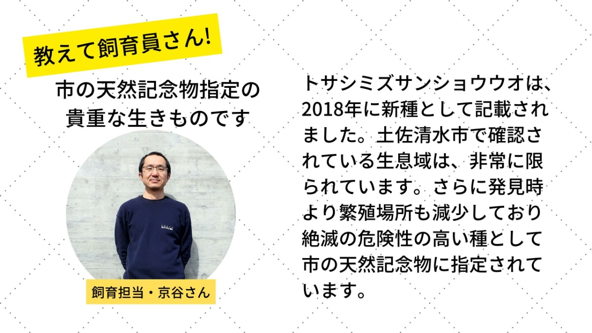 「足摺海洋館」ではオス・メス両方飼育している。とても臆病な性格のため、物陰に隠れてじっとしていることが多い。