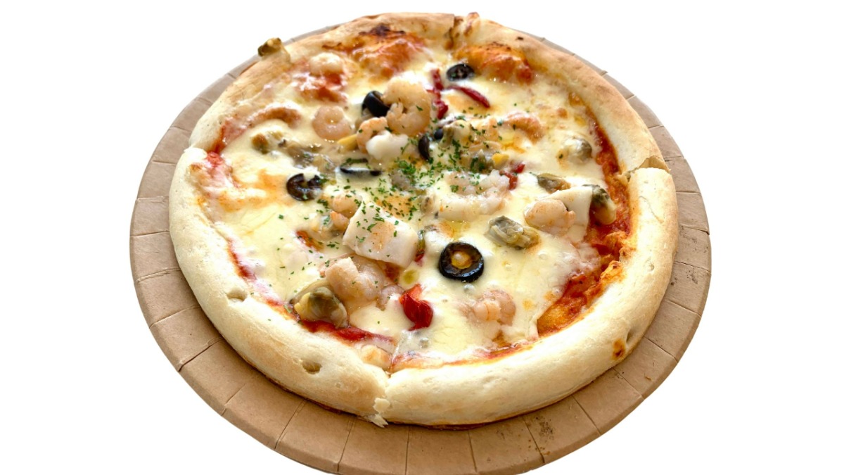 薄めのピザ生地の上に、イカや貝、エビなどシーフードをたっぷりとのせた人気メニュー。