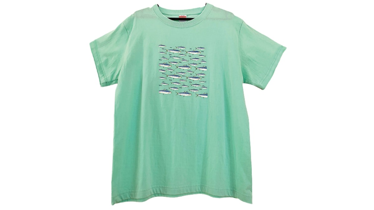 イワシが泳いでいる姿がとても可愛いオリジナルTシャツ。土佐清水市出身のデザイナー勝間栄典さんがデザイン。