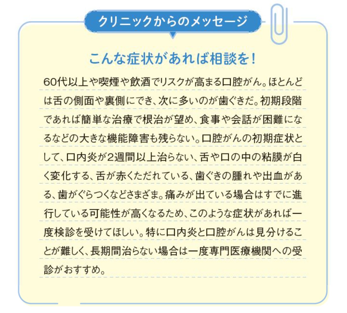 口の中は自分で簡単にチェックできる場所であり、口腔内の粘膜が赤い、白い、痛い、または口内炎が2週間続いているなど異変がある場合は、我慢せずに検診を受けてほしいという同院。痛みや違和感が長く続く場合は、ただの口内炎だと思って放置せず、取り返しのつかなくなる前に専門の医療機関に受診することが大切だ。