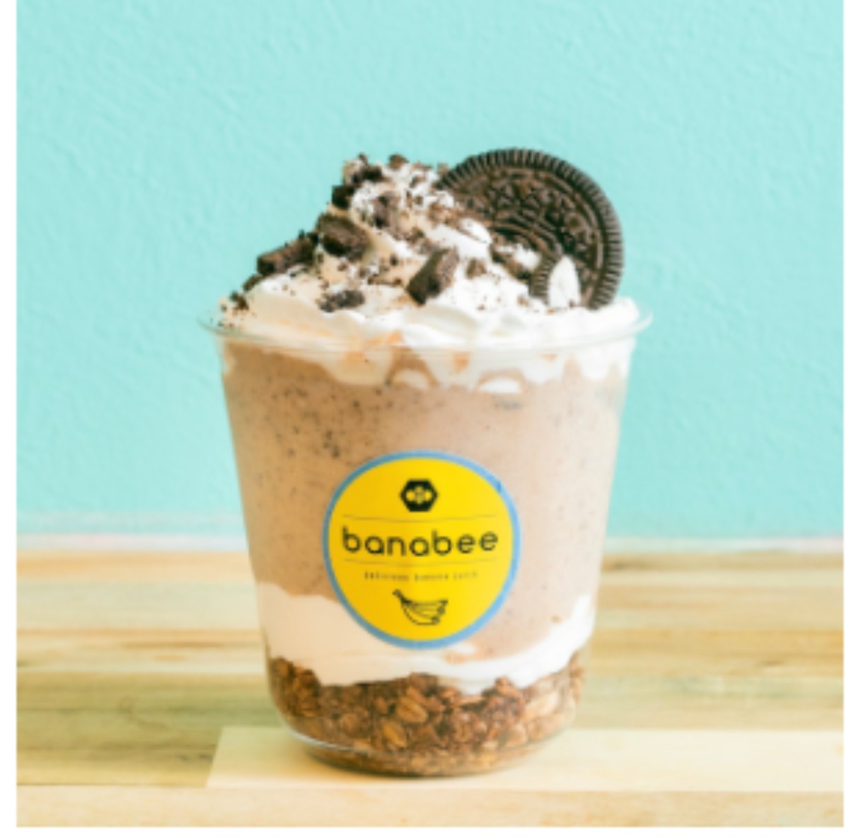 基本の恋バナナジュースにチョコとクッキークリームをミックス! オートミール&クッキークリームのザクザク食感がたまらない贅沢なバナナジュースパフェ♪