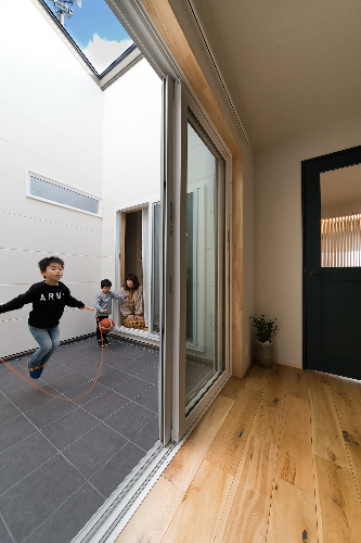 玄関フロアからも、リビングからも出入りできる、まさに家の中心となる中庭。縄跳びやバスケの練習など、お子さんも安心して遊べます